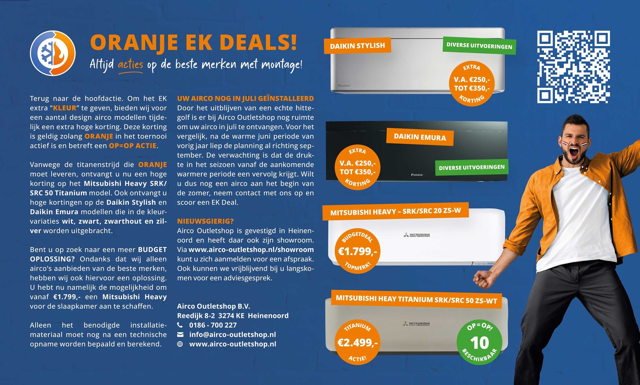 Om het EK extra “KLEUR” te geven, bieden wij voor een aantal design airco modellen tijdelijk een extra hoge korting. Deze korting is geldig zolang Oranje in het toernooi actief is. Het betreft een OP=OP actie en dus beschikbaar zolang de voorraad strekt. Vanwege de titanenstrijd die Oranje moet leveren, ontvangt u nu een hoge korting op het Mitsubishi Heavy SRK/SRC 50 Titanium model. Ook ontvangt u hoge kortingen op de Daikin Stylish en Daikin Emura modellen die in de kleurvariaties wit, zwart, zwarthout en zilver worden uitgebracht. Klik hier voor de spelregels voor een verlengde garantie van maar liefst 10 jaar met een gratis eerste onderhoudsbeurt.